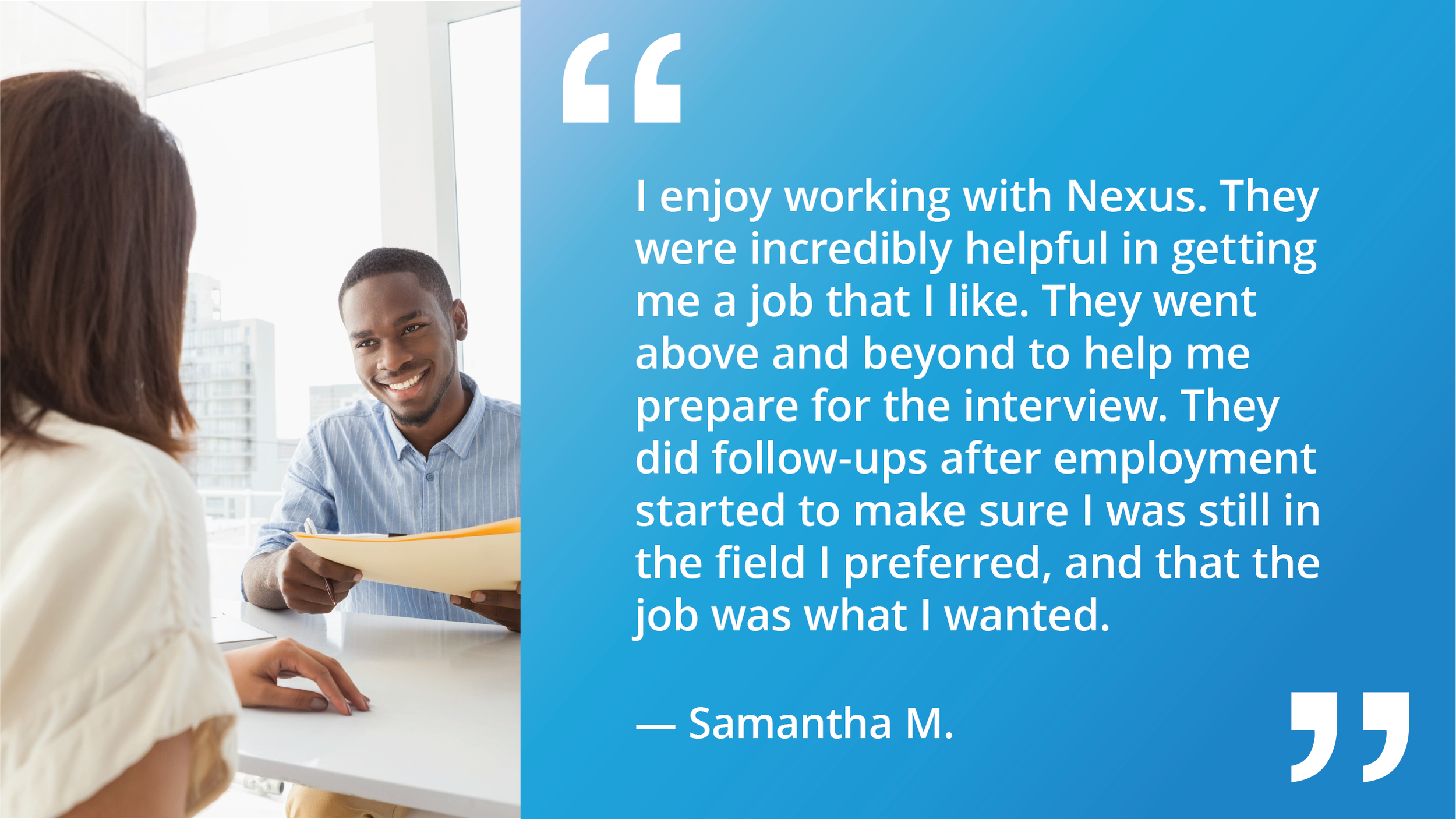 We want you to experience the friendliness Nexus Staff offers and the ability to find other great co-workers for you. We offer a genuine desire to serve you and your company and find others who want to do the same.