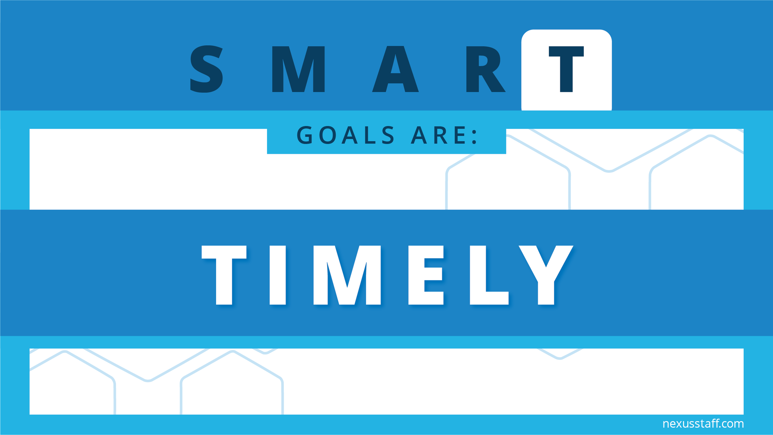 Last but not least, SMART goals are ones that are timely. They have a clear timeline including a start and end date. Once those time marks have passed, whether or not you have achieved the goals you set is a clear indicator of whether or not you have been successful and if you need to reassess or not.